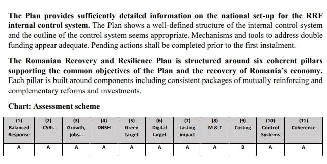 Pentru ca un PNRR să fie aprobat, trebuie îndeplinite 11 criterii, care arată împreună cât de relevant, eficace, eficient și coerent este un plan de reforme și investiții, explică europarlamentarul USR-PLUS Dragoș Pîslaru, membru al Comisiei Parlamentului European de monitorizare a PNRR. Pentru fiecare criteriu, Comisia acordă calificative de la A la C, unde A înseamnă că criteriul a fost respectat în mare măsură, iar C înseamnă că criteriul nu a fost respectat sau a fost respectat într-o mică măsură. Un calificativ C descalifică automat un PNRR.
