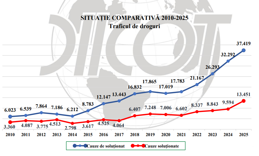 În 2010, parchetele din toată țara aveau de soluționat 6.023 de cauze de trafic de droguri. 15 ani mai târziu, în 2025, cifra este de 6 ori mai mare și ajunge până la 37.419, potrivit raportului DIICOT.
