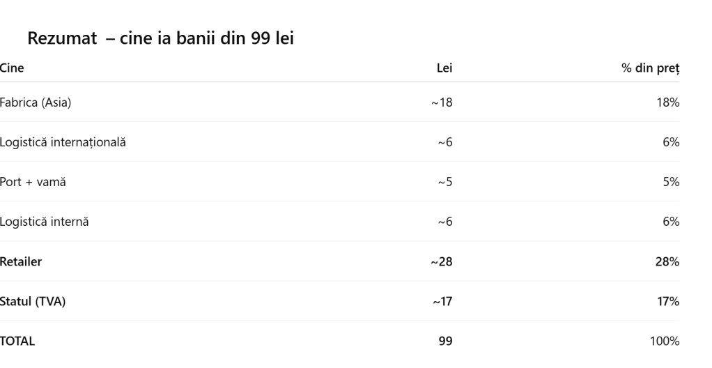 Să luăm cazul unei jucării al cărei preț la raft e de 99 de lei (TVA inclus). Unde ajung banii: