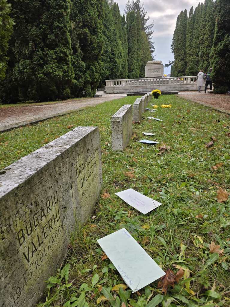 Ajunși la Zvolen, colonelul Teodorescu a așezat pe câteva morminte, pentru o fotografie simbolică, câteva scrisori scrise de copii români în 2018, la Centenarul Marii Uniri, în cadrul unei activități numite „Scrisori din tranșee”, unde copiii au adresat scrisori către veterani din războaiele mondiale.