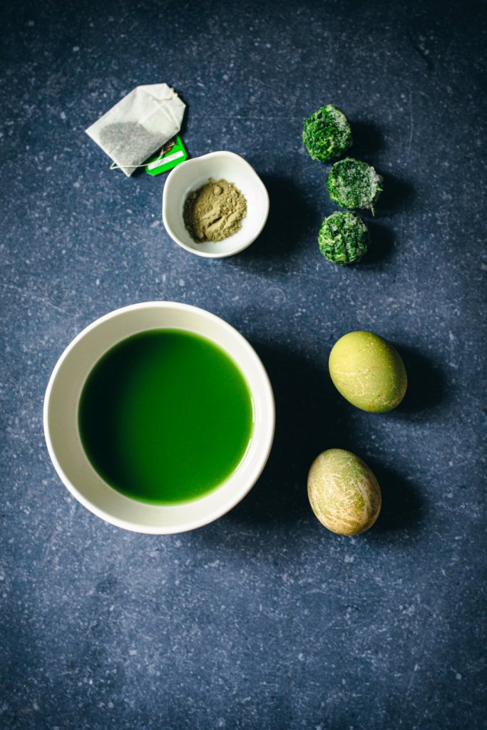 Spanacul, matcha și ceaiul verde creează tonuri pale de verde, ideale pentru un aspect natural și discret. Andreea recomandă o combinație de spanac congelat (400g), 1 lingură de matcha și 5 pliculețe de ceai verde într-o jumătate de litru de apă, fierte timp de 20 de minute. Pentru un verde mai puternic se țin ouăle cât mai mult în apa obținută astfel.