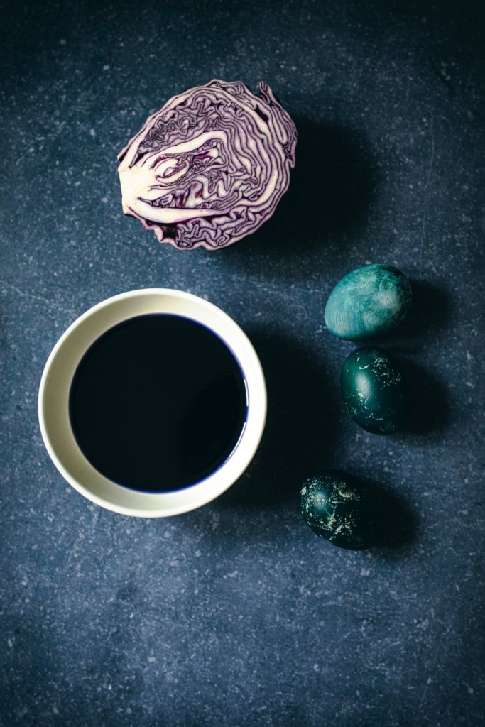 Varza roșie (o jumătate tăiată mărunt) fiartă 20-30 de minute oferă o nuanță surprinzătoare de albastru. După răcire și strecurare, ouăle se lasă în soluție până la obținerea culorii dorite.