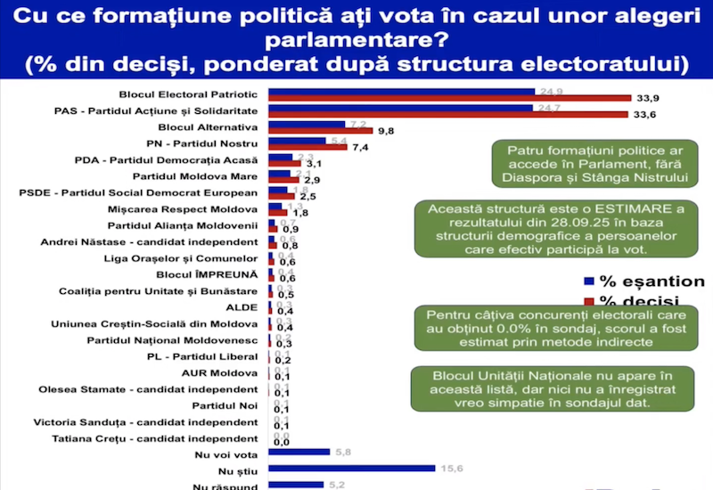 Cel mai recent sondaj iData arăta că învingător în cursa pentru Parlamentul Republicii Moldova ar fi ieșit Blocul Patriotic cu aproape 25%, fiind urmat îndeaproape de PAS cu 24,7%, potrivit Ziarului de Gardă (ZdG).
