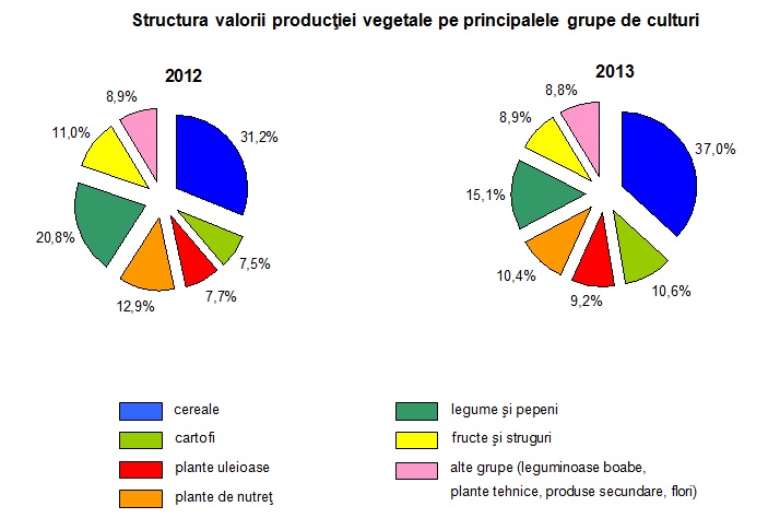 Astfel, in anul 2013 comparativ cu anul 2012, ponderea culturilor de cereale si de cartofi a crescut cu 5,8 puncte procentuale, respectiv cu 3,1 puncte procentuale, in timp ce ponderea culturilor de legume si pepeni a scazut cu 5,7 puncte procentuale, iar cea a culturilor de plante de nutret cu 2,5 puncte procentuale