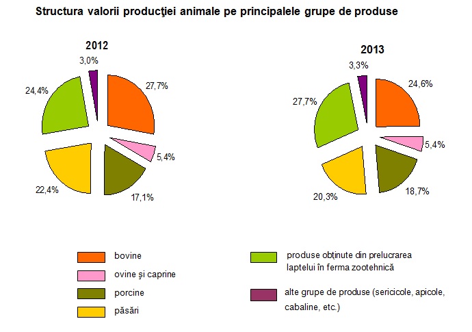 Structura productiei animale pe principalele grupe de produse prezinta mici diferente fata de anul precedent. La porcine, ponderea a crescut cu 1,6 puncte procentuale, iar la bovine si la pasari ponderea a scazut cu 3,1 puncte procentuale, respectiv cu 2,1 puncte procentuale.