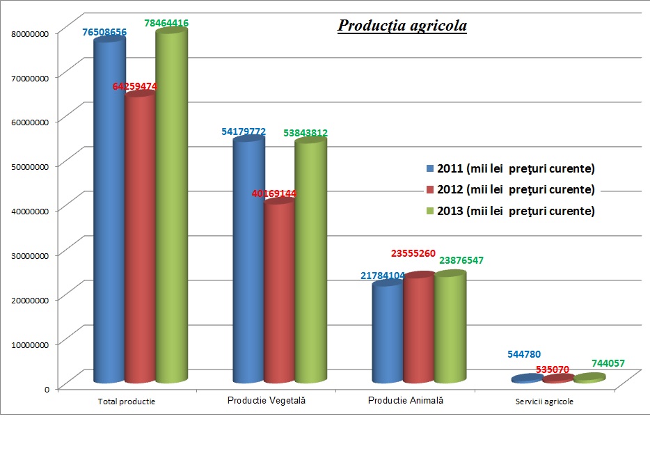 Mai jos avem datele privind productia agricola din ultimii trei ani (exprimata in mii de lei preturi curente). Datele sunt calculate in preturi comparabile (click pe imagine pentru a o mari, daca e cazul)