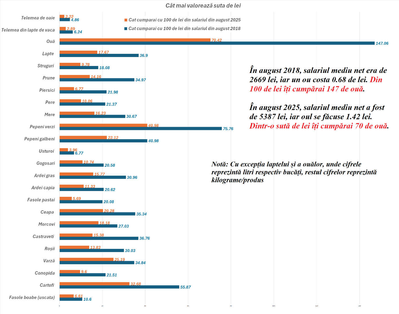 În urmă cu șapte ani, o sută de lei avea o cu totul altă putere. În august 2018, cu 100 de lei puteai cumpăra 147 de ouă. În august 2025, cu un salariu dublu, nu mai poți lua nici jumătate: 70 de ouă.