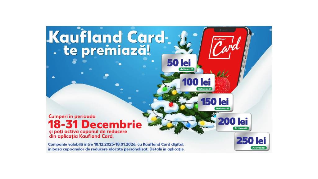 În pragul sărbătorilor, Kaufland România vine în sprijinul clienților cu o promoție fulger: între 18 și 31 decembrie 2025, utilizatorii Kaufland Card pot obține vouchere de până la 250 de lei, în funcție de valoarea cumpărăturilor realizate în această perioadă.