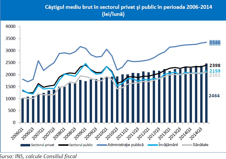 In prezent salariul mediu brut din administratia publica este de 3680 de lei, iar in sectorul privat depaseste cu putin 2630 de lei, potrivit datelor din Raportul pe 2014 al Consiliului Fiscal, publicat marti. O crestere a lefurilor bugetarilor cu 10% ar mari decalajul salarial intre admnistratia publica si privat la peste 1042 de lei. In favoarea celor de la Stat, desigur. Diferenta vine din politica salariala diferita dintre Stat si Privat. La cel privat, cresterea salariului vine insotita doar de cresterea eficientei angajatului. La Stat ea vine printr-o Ordonanta de Urgenta.