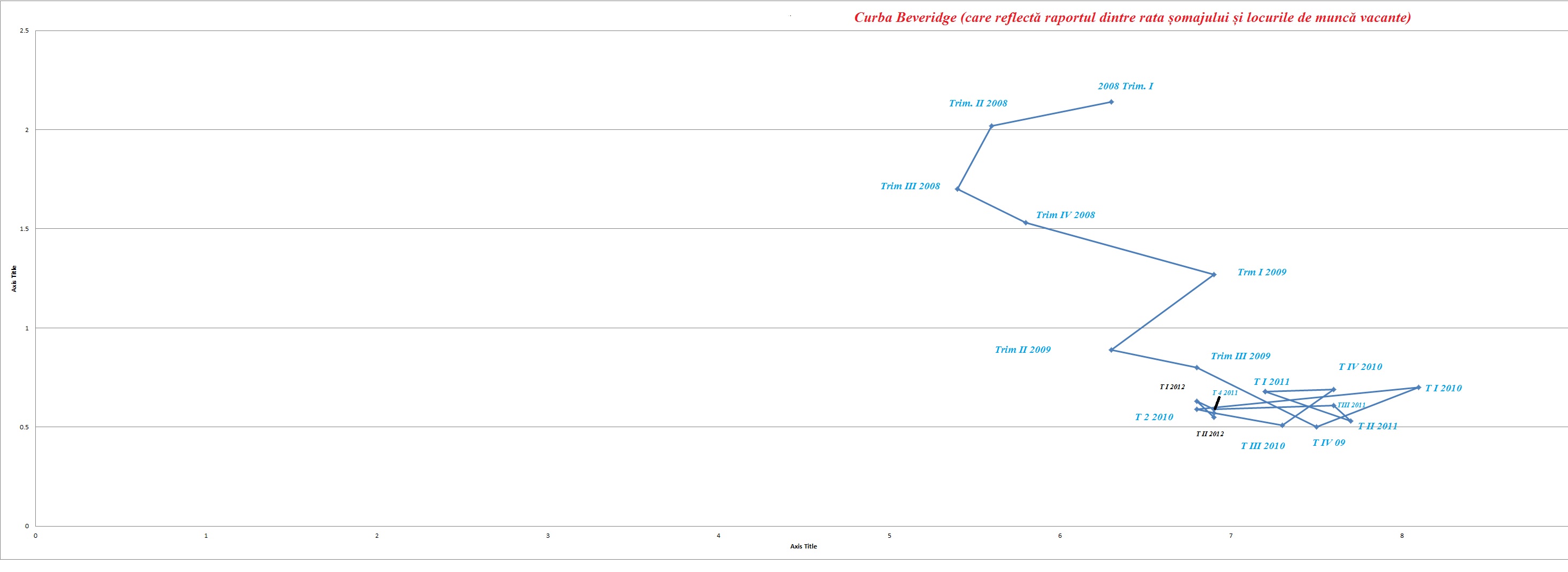 • Atunci cand ne uitam la piata muncii, unul dintre cele mai bune instrumente este asa numita curba Beveridge. Ea analizeaza legatura dintre somaj si locurile de munca vacante. Daca aceasta curba se orienteaza mult spre stanga , semnalul este ca somerii sunt compatibili cu locurile de munca vacante, in timp ce o curba mult spre dreapta indica lipsuri severe si un somaj de echilibru inalt. Atat somajul cat si locurile de munca vacante se schimba periodic ca urmare a evolutiei economiei, iar pozitia pe curba poate indica in care faza se afla economia in ciclul de afaceri. Recesiunile, de exemplu, sunt asociate in general cu un somaj ridicat si putine locuri de munca vacante, corespunzatoare punctelor de pe curba situate mult spre dreapta-jos, in timp ce in expansiune se verifica opusul, adica punctele cele mai din stanga sus. Sa vedem cum arata in cazul Romaniei curba Beveridge.Calculele se refera pana la finele anului trecut.