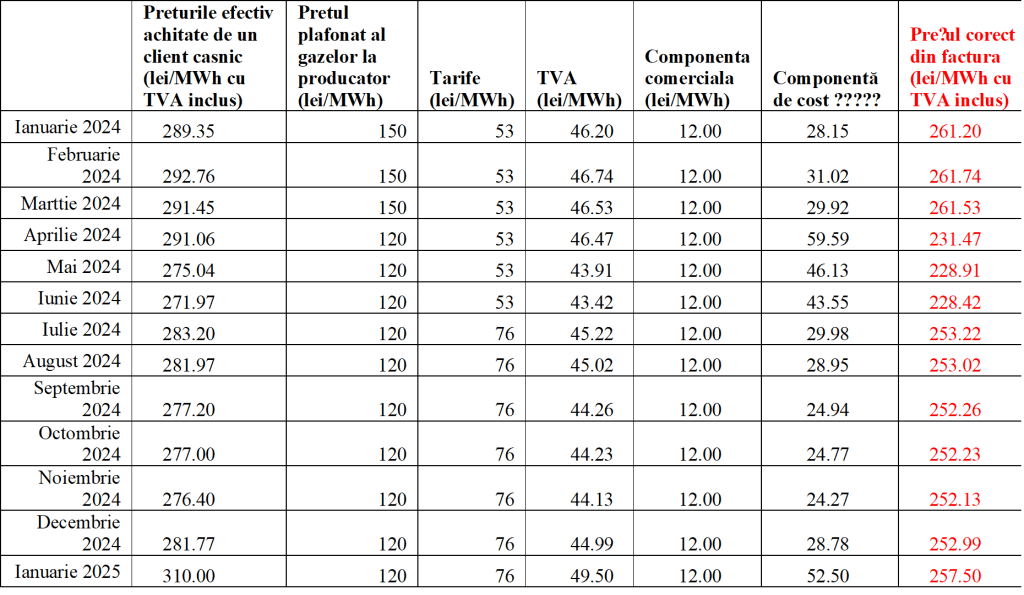 În situatia în care componentele de cost ar fi fost doar cele posibil de identificat: preț plafonat al gazelor din producția internă, componenta comercială fixă, tarife și TVA, prețul ar fi fost cu 23% mai mic decât cel efectiv achitat în anul 2024, respectiv cca 0,25 lei/KWh cu TVA inclus.