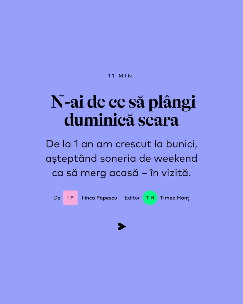 Și mama a crescut departe de părinți, la bunicii ei din Câmpina care locuiau la 300 de km distanță. Tata și-a părăsit satul la 14 ani pentru un orășel, 50 de kilometri mai departe de casă, ca să meargă la liceu și să poată da ulterior la facultate. Noi locuiam la 5 minute cu mașina unii de alții, practic, nici nu eram despărțiți, practic locuiam împreună. Practic, nici n-aveam de ce să plâng duminică seara.