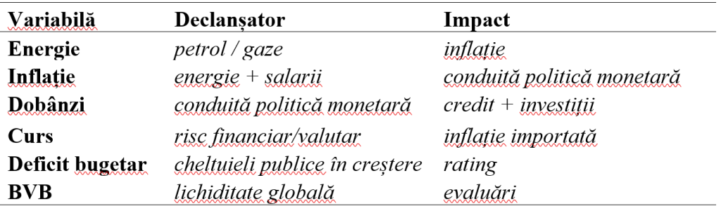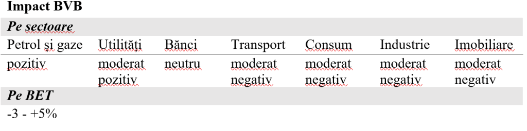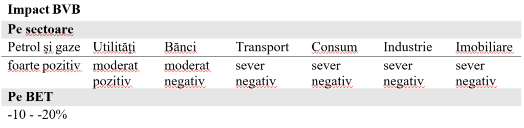 În acest scenariu, ceea ce va fi vizibil în piața românească nu este o criză clasică implicită, ci o resetare a pozițiilor de lider în care narațiunea dominantă va reevalua pozitiv companiile din zona de producție de energie și resurse naturale, celelalte companii (consum, finantare, logistică etc) urmând a fi reevaluate mai prudent.
