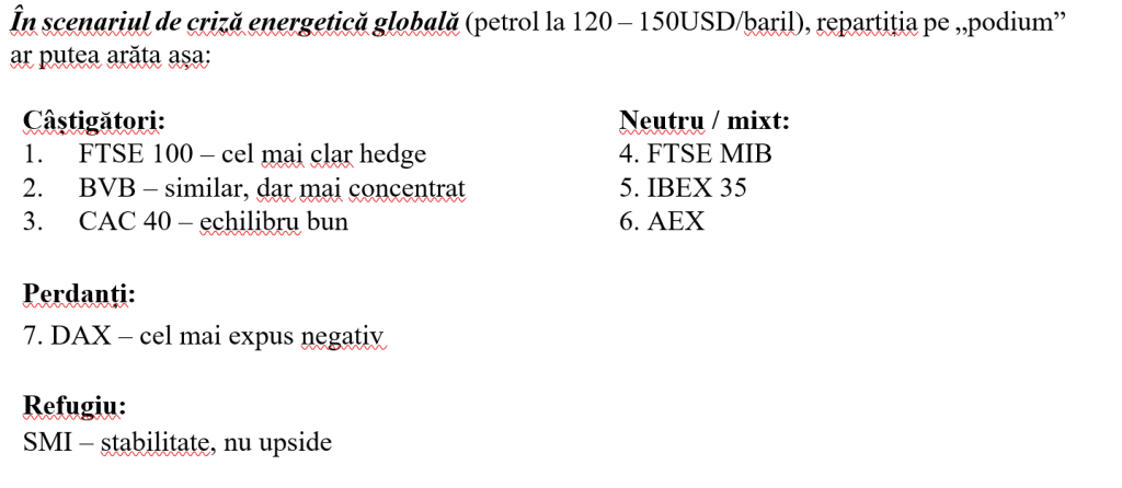 Caracteristicile principalelor burse europene din perspectiva structurii lor și a modului probabil în care pot reacționa la un șoc precum cel actual (petrol/energie), pot explica natura temporară sau de durată a șocului, la nivelul percepției piețelor. Ceea ce se poate observa acum (după circa 4 săptămâni de la începerea conflictului) este că indicii europeni au reacționat în bloc (corecții de circa 8-10%), o conduită care poate caracteriza o perioadă necesară piețelor pentru a înțelege dacă noul context este un vârf temporar sau un nou cadru de funcționare, înainte de a începe să aibă o evoluție diferențiată. Chiar dacă în Europa indicii bursieri au un grad mare de concentrare sectorială, sunt vizibil influențați de așa-numiții „campioni naționali” și sunt fundamental diferiți de cei din SUA (piață în care „tech”, sectorul tehnologic, domină), bursele/piețele vor avea întotdeauna cel puțin două caracteristici esențiale: i) – nu vor răspunde identic la același șoc și ii) – nu pot fi neutre, indiferent de tipul de șoc.