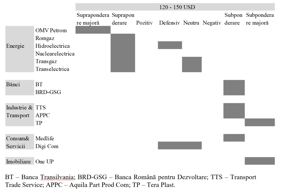 În acest scenariu (100 – 120 USD/baril) indicele BET ar putea demonstra o reziliență relativă (stagnare, dar fără prăbușire). Reperele pieței/indicelui ar fi de susținere de pe partea de energie, dobânzi mai mari – marje mai bune și economie mai slabă – calitate mai slabă a activelor pentru bănci, iar pentru restul pieței o evoluție lateral-negativă. O cădere generalizată nu va caracteriza contextul, dar o „îngustare” a bursei și concentrarea performanței pe cîteva nume este. Investitorii nu vor cumpăra en-gross (în bloc) BVB, ci energia din BVB (selectiv), iar BVB nu va intra într-o fază de panică, ci în una de rezilieță relativă.