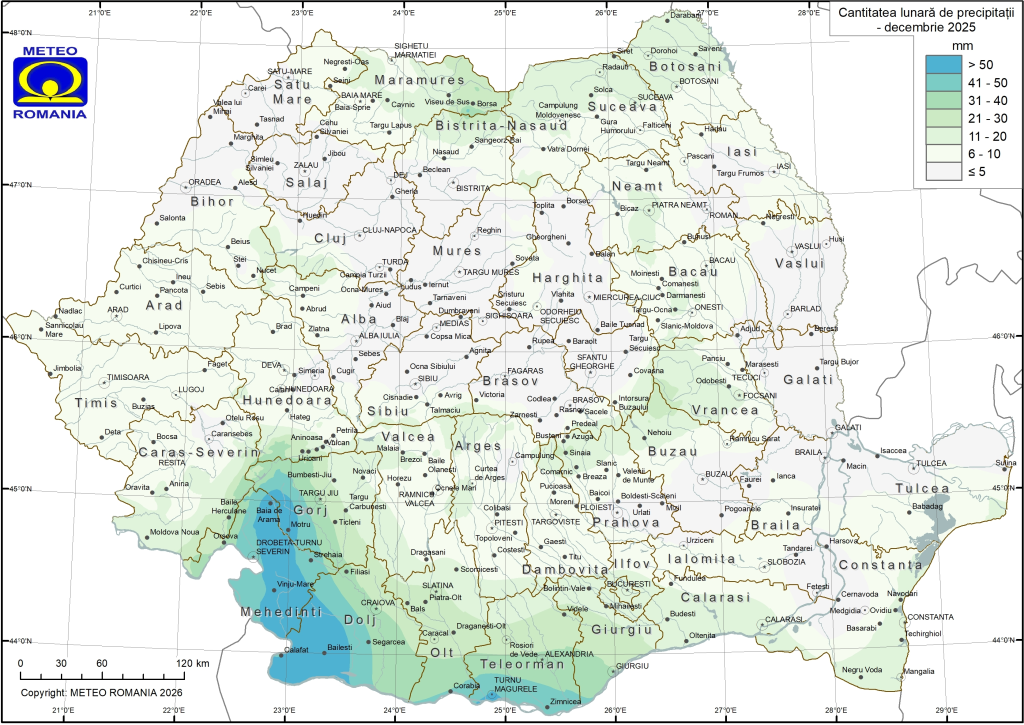 Cantitatea medie totală de precipitații pe țară din luna decembrie 2025 a avut valoarea de 10,7 mm, fiind cu 76% mai mică față de mediana intervalului de referință standard (1991 – 2020). Cea mai mare valoare a abaterii negative a fost de 99,6%, fiind înregistrată la stația meteorologică Târgu Secuiesc.