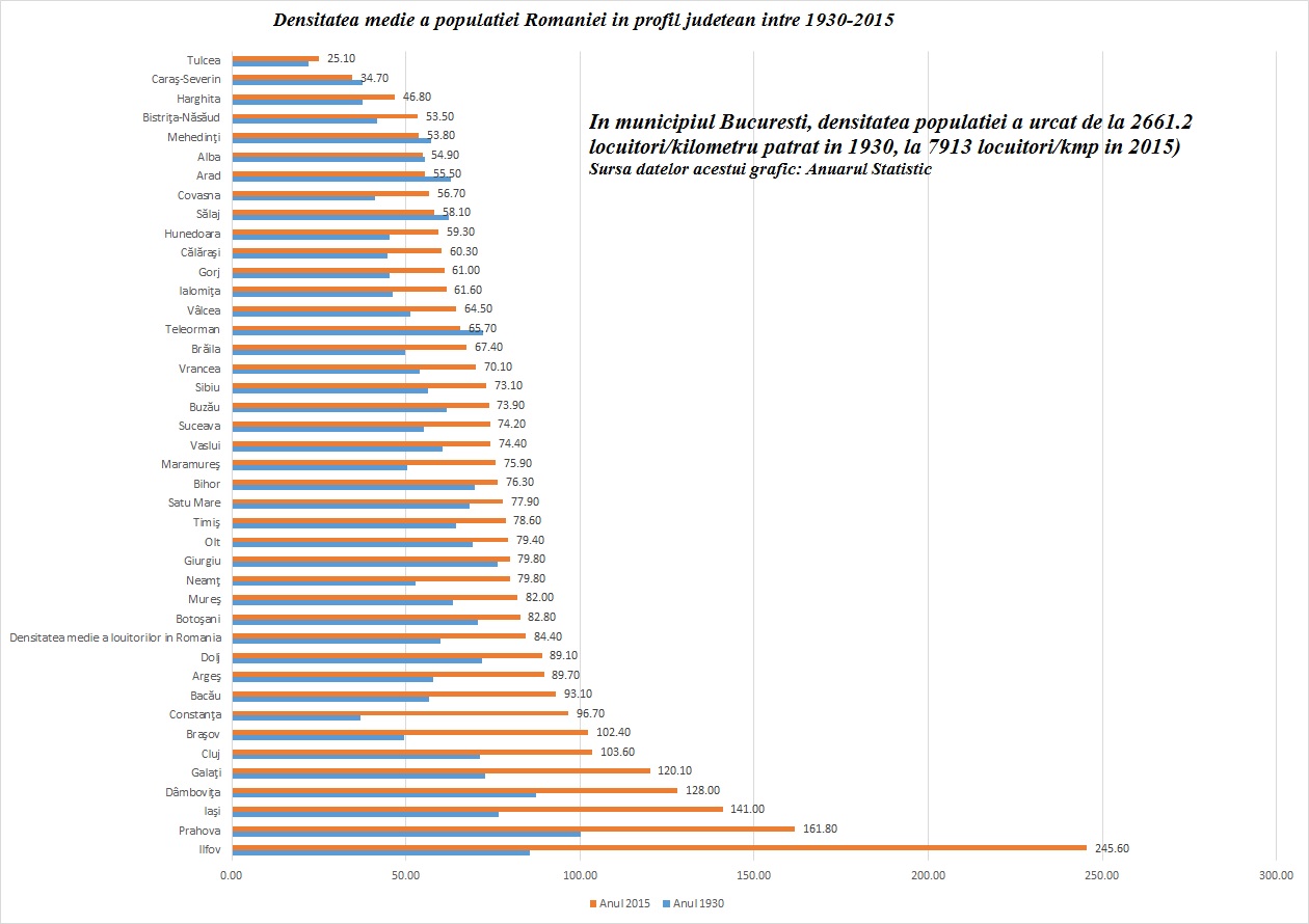 Inca ceva: Desi populatia Romaniei a crescut din 1930 incoace, exista judete unde densitatea/kilometrul patrat a scazut. In total sunt 5 asemenea judete.