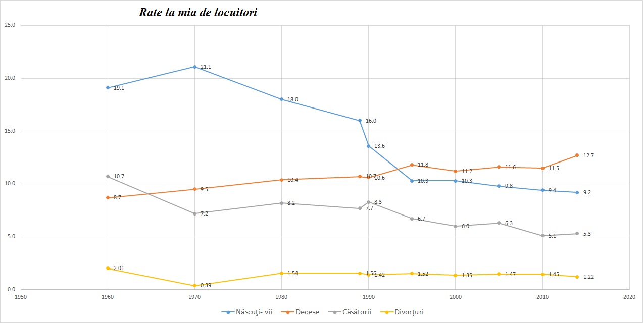 Mai jos aveti ratele casatoriilor, nasterilor, divorturilor si deceselor la mia de locuitori, din 1960 incoace.