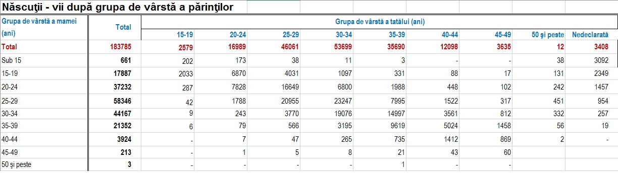 Mai jos aveti nou-nascutii dupa grupa de varsta a parintilor: