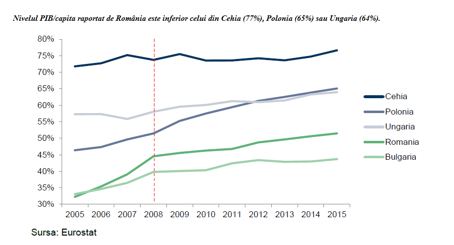 Romania a inregistratin prima jumatate a anului una dintre cele mai rapide rate de crestere economica din Uniunea Europeana din ultimii ani- 5,2%, urmatorea clasata fiind Slovacia, cu 3,7%. Desi suntem iar tigrii UE, valoarea Produsului Intern Brut/ locuitor, ajustat cu puterea de cumparare standard (un indicator des folosit pentru nivelul de trai) este in cazul Romaniei (pentru 2015) de numai 13.900 EUR, aproape de doua ori mai putin decat media UE (15). Altfel spus, suntem la jumatate din media raportata de UE (15), cu doar 5pp mai mult decat eram in 2008.