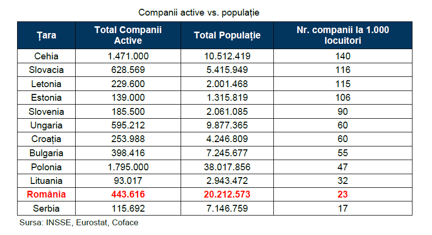 Acest nivel de concentrare se poate si el explica prin diferentele de spirit antreprenorial fata de tarile din regiune. Asa cum se observa imai jos, Romania detine al doilea cel mai scazut nivel, dupa Serbia, in ceea ce priveste numarul de companii raportat la totalul populatiei.
