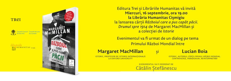 Editura Trei şi Librăriile Humanitas va invită la un dialog pe tema Primului Război Mondial între Margaret MacMillan şi Lucian Boia, miercuri, 16 septembrie, de la ora 19.00, la Librăria Humanitas de la Cişmigiu. Evenimentul este prilejuit de lansarea volumului Războiul care a pus capăt păcii. Drumul spre 1914 scris de Margaret MacMillan şi a noii colecţii Istorie a Editurii Trei.