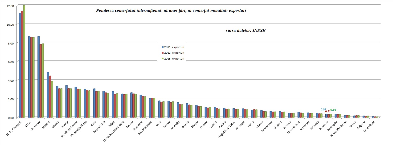 Desigur, discutam de medie. Probabil ca la masini depasim 1%, iar la creioane suntem sub 0,005%. Dar in medie, la 10.000 de unitati dintr-un bun exportat intr-un an pe plan mondial, cota rRomaniei este de 36 de unitati din acel bun. Mai precis, suntem a sasea tara de la coada clasamentului dintr-un total de 39 de tari analizate de INSSE. Cat priveste importurile, suntem tot pe-acolo. Pe primele locuri sunt americanii si chinezii, cu precizarea ca la exporturi cota SUA scade, iar cea a Chinei creste. De asta, Romania ar avea nevoie de un fel de Master Plan al comertului exterior, dublat de o ofensiva a diplomatiei economice