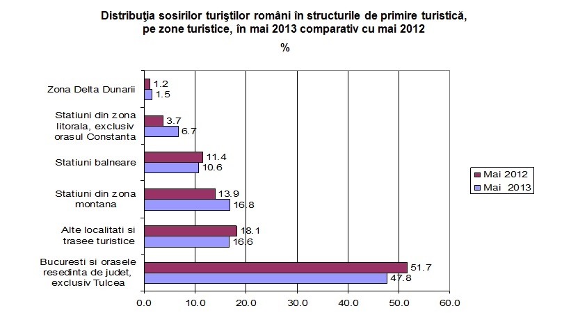 In perioada 1.I-31.V.2013, comparativ cu perioada corespunzatoare din anul precedent, sosirile in structurile de primire turistica cu functiuni de cazare, au inregistrat o crestere cu 5,3 % si innoptarile o scadere cu 0,2 %.