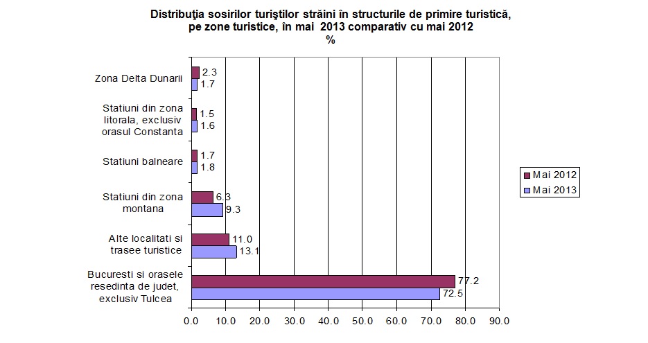 Sosirile vizitatorilor straini in Romania, inregistrate la punctele de frontiera, au fost in luna mai 2013 de 660,9 mii, in scadere cu (-1,8%) fata de luna mai 2012. Majoritatea vizitatorilor straini provine din tari situate in Europa ( 92,9%). Din statele Uniunii Europene s-au inregistrat 61,9% din totalul sosirilor vizitatorilor straini in Romania. Dintre statele Uniunii Europene cele mai multe sosiri s-au inregistrat din Ungaria (34,1%), Bulgaria (22,4%), Germania (10,6%), Italia (7,0%), Austria (4,7%) si Polonia (4,4%).