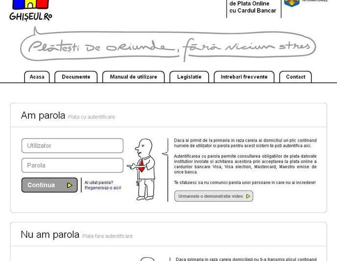 Platile prin internet cu cardul bancar prin Ghiseul.ro pot fi facute cu autentificare (pe baza de utilizator si parola) si fara autentificare (pe baza CNP-ului, daca stii exact ce ai de platit). Detalii aici.