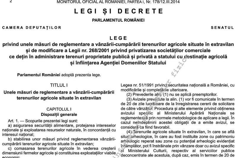 DOCUMENT Legea care restrictioneaza vanzarea terenurilor agricole, publicata in Monitorul Oficial