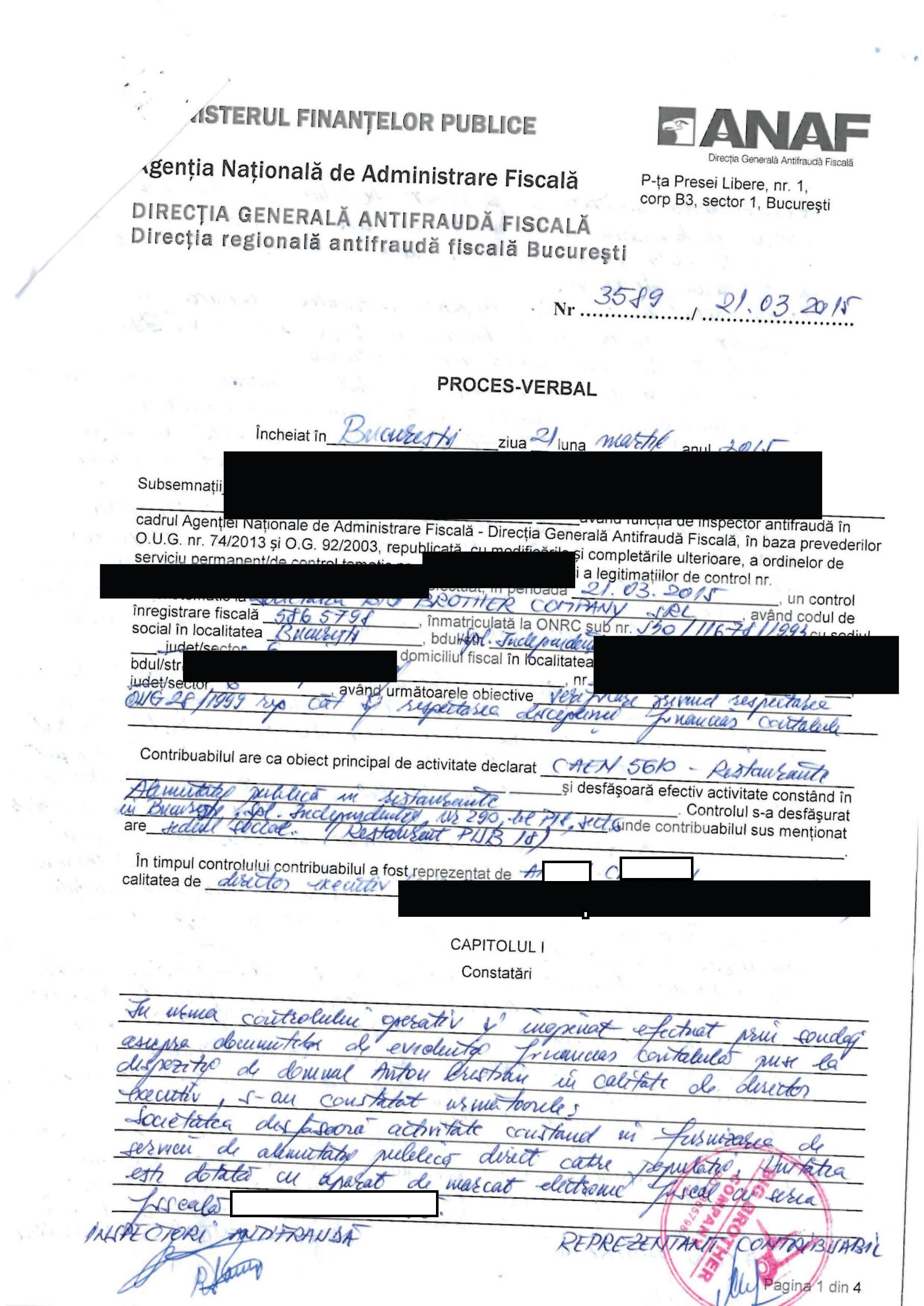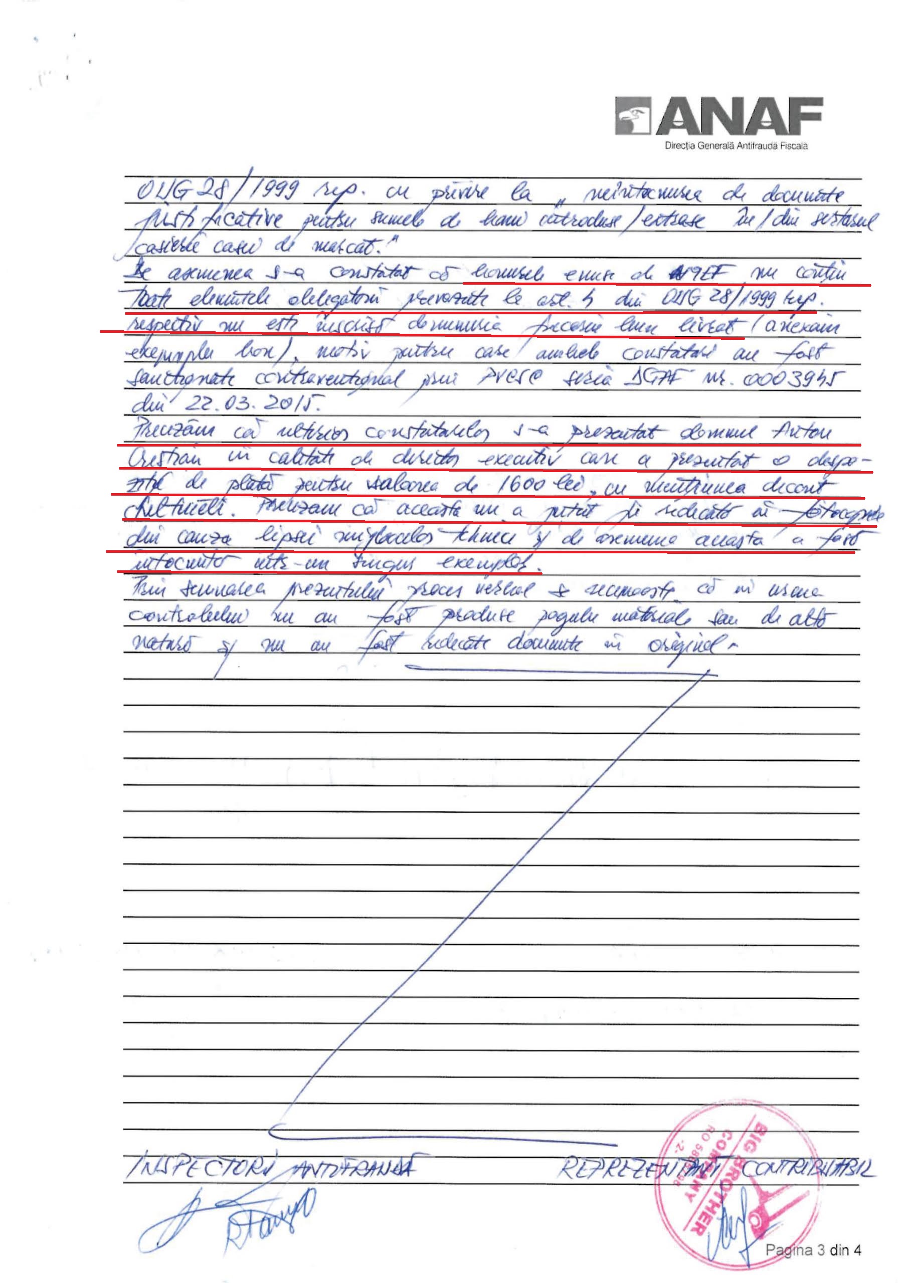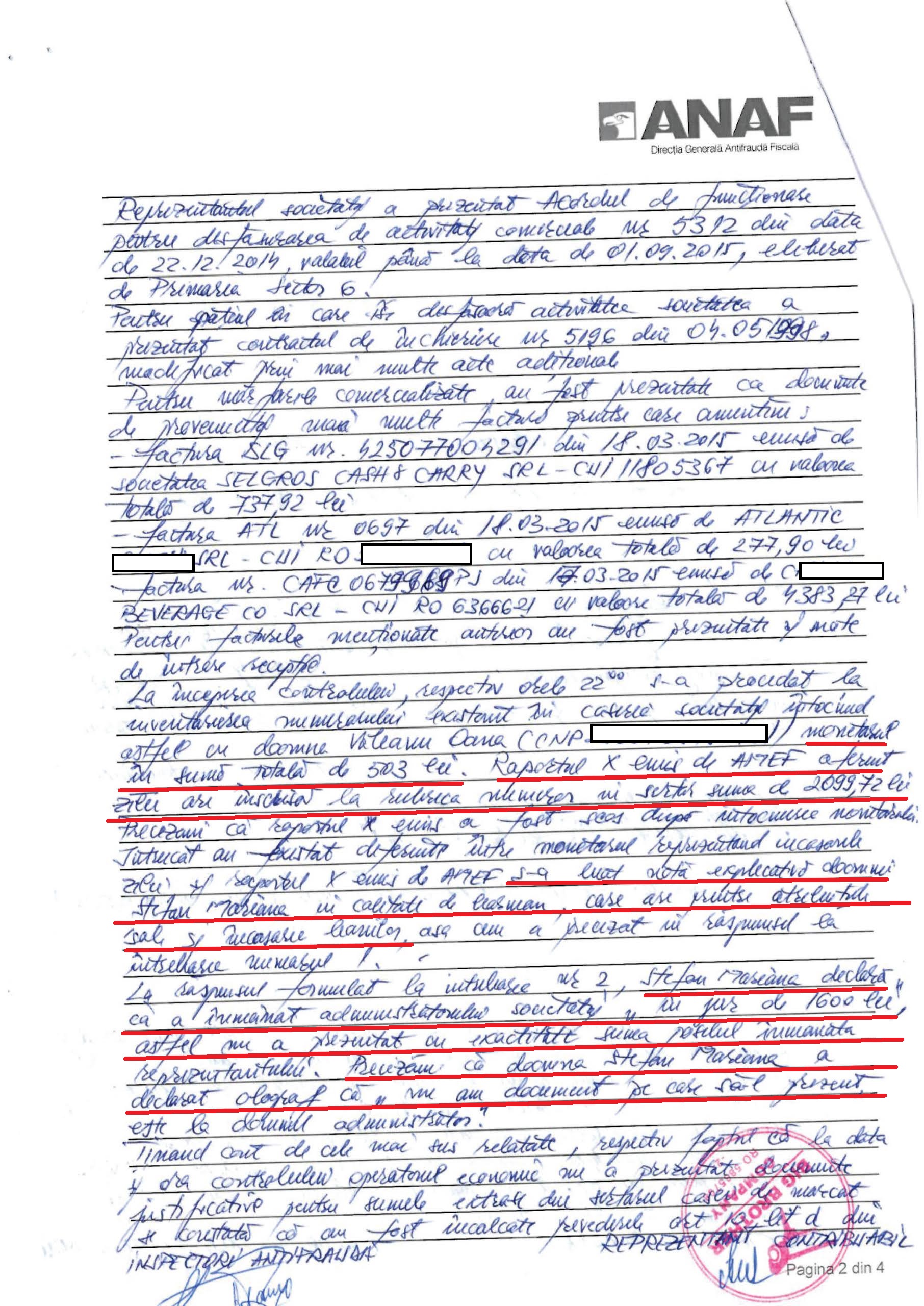 „La inceperea controlului, respectiv orele 22 s-a procedat la inventarierea numerarului gasit in casieria societatii, intocmind astfel cu doamna (…) monetarul in suma totala de 503 lei. Raportul X aferent are inscrisa la rubrica numerar in sertar suma de 2099,72 lei. Precizam ca raportul X emis a fost scos dupa intocmirea monetarului. S-a luat nota explicativa barmanitei care a declarat olograf ca a inmanat administratorului societatii „in jur de 1600 de lei. Precizam ca doamna a declarat in scris ca nu are document pe care sa-l prezint”, se arata in procesul verbal de control de la PUB18.