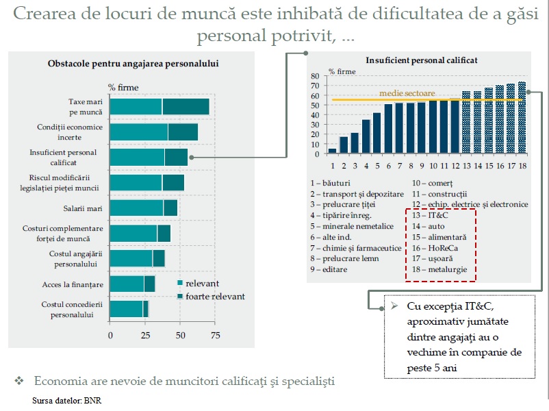 „Dezvoltarea ramurilor cu o inzestrare tehnologica superioara, alaturi de actiunea inhibitoare a unor factori precum majorarea accelerata a salariului minim brut pe economie in ultimii doi ani, impozitarea ridicata a muncii si/sau existenta contractelor colective au condus la diminuarea capacitatii economiei de a crea locuri de munca. Cresterea somajului structural poate reprezenta un element important in evaluarea pozitiei ciclice a economiei (relevant in procesul de elaborare a politicii monetare), in contextul in care persoanele ramase in cautarea unui loc de munca, dar care nu au abilitatile cautate de companii, nu concureaza de fapt pentru locurile de munca existente. Prin urmare, aceste persoane nu pot influenta procesul de stabilire a salariilor si, prin urmare, nici pe cel de stabilire a preturilor.”, se arata intr-un studiu elaborat de BNR.