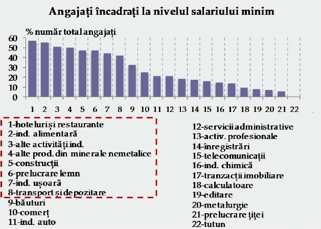 In ramuri precum industria alimentara, usoara sau constructii, cresterea salariului minim brut pe economie din perioada 2008-2015 este superioara cresterii productiei, toate cele trei ramuri avand mai mult de 40% dintre angajati incadrati la pragul minim.