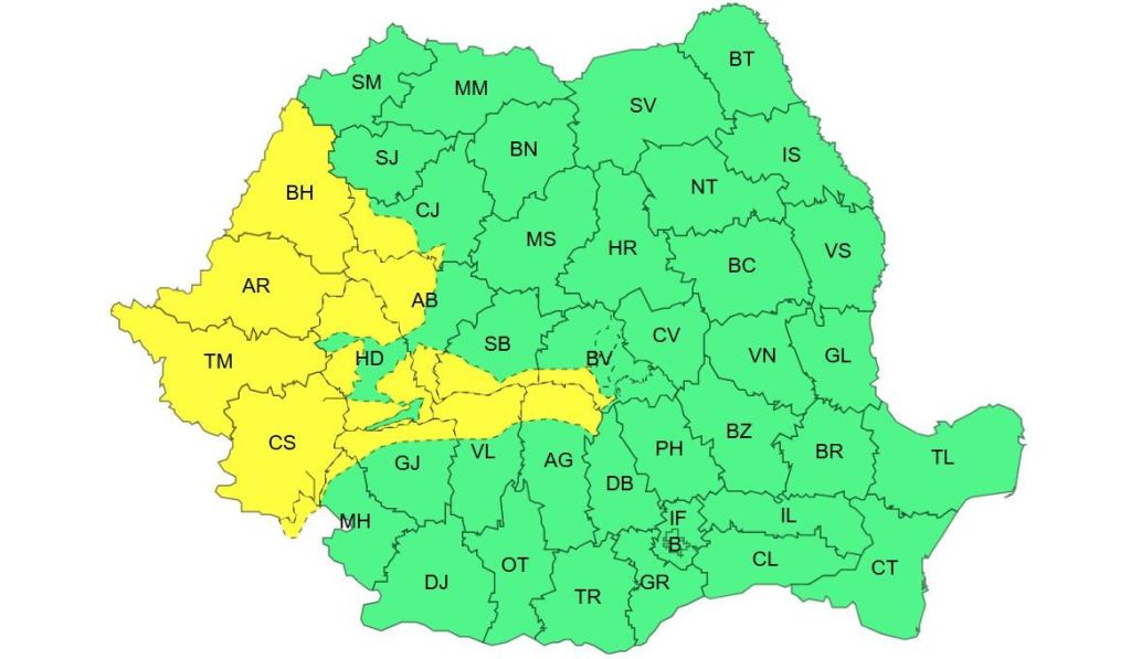 În intervalul 23 octombrie, ora 21:00 – 24 octombrie, ora 10:00, va fi în vigoare un Cod galben în Banat și Crișana, unde vântul va avea intensificări temporare cu viteze de 50 – 70 km/h, conform ANM.