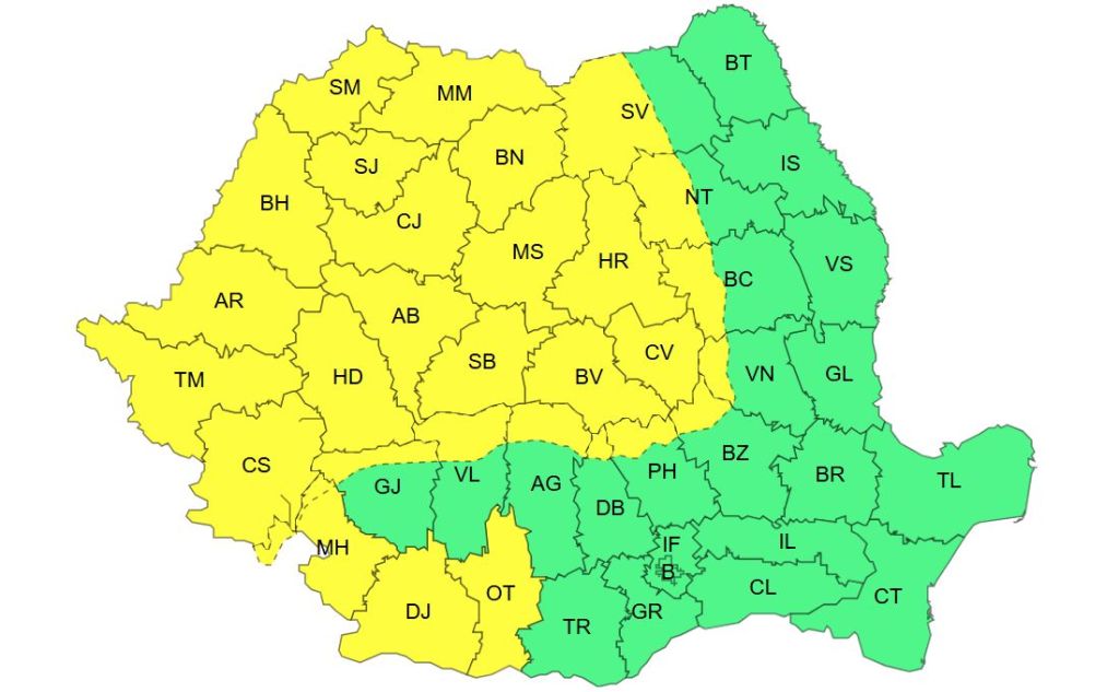 Meteorologii au emis două atenționări Cod galben de vânt puternic care vizează mai multe județe din nordul, vestul și centrul României.