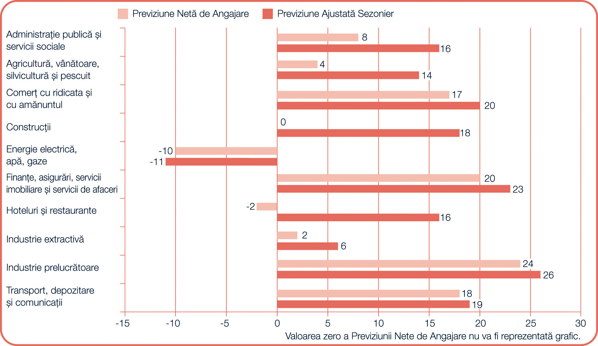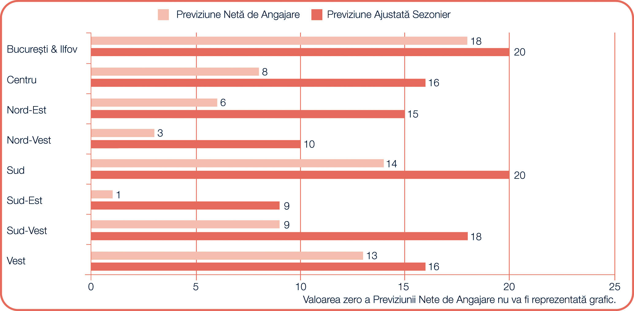 Notă: Previziunea Netă de Angajare se obține făcând diferența dintre procentul de angajatori care anticipează o creștere a volumului total de angajări și procentul de angajatori care prevăd o scădere a angajărilor în locația lor, în trimestrul următor. Pentru țările care au acumulat date cel puțin 17 trimestre consecutiv, printre care și România, cifrele citate au fost supuse ajustării sezoniere, cu excepția cazului în care se specifică altfel.