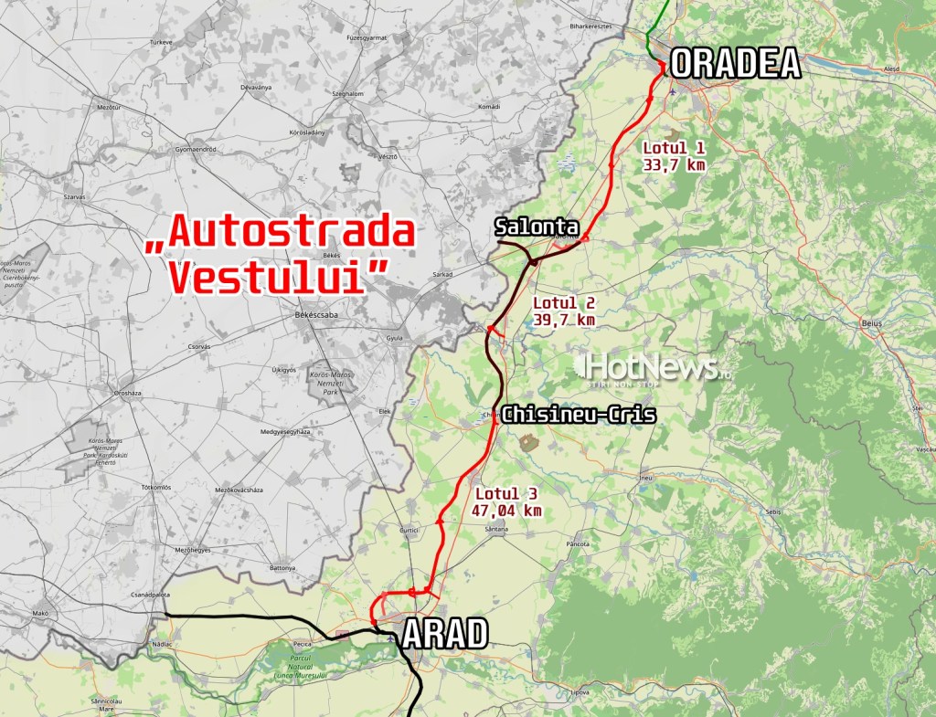 – Lotul 2 (39,7 km), de la Salonta la Chișineu-Criș, la care se adaugă drumul de legătură până la granița cu Ungaria (10 km). Contract semnat în data de 23 septembrie 2025 cu asocierea Straco-Onur pentru 2,76 mld lei (termen de finalizare: 24 de luni).
