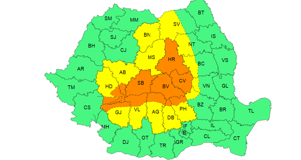 Tot în cursul zilei de marţi, până la ora 22.00, judeţele Sibiu, Braşov, Covasna, Harghita şi zona de munte a judeţelor Gorj, Hunedoara, Alba, Vâlcea, Argeş, Dâmboviţa şi Prahova se vor afla sub cod portocaliu de averse importante cantitativ, însoţite de descărcări electrice, vijelii şi grindină. În timp scurt sau prin acumulare, cantităţile de apă vor fi de 30…40 l/mp şi izolat de 50…60 l/mp, mai precizează meteorologii.