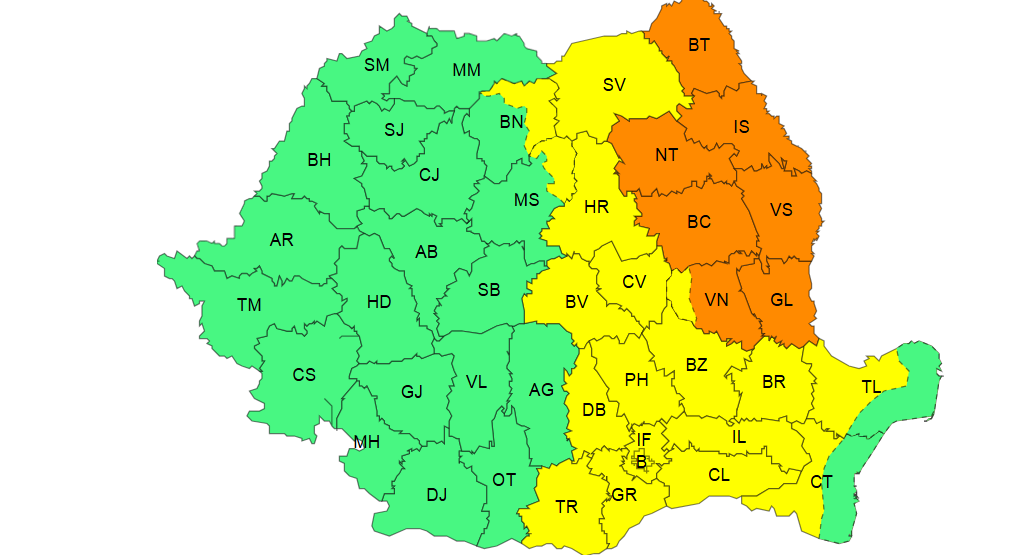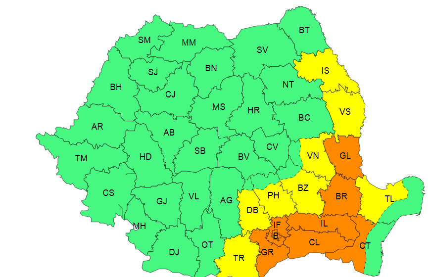 În acelaşi interval, judeţele Botoşani, Neamţ, Iaşi, Bacău, Vaslui, Galaţi şi Vrancea se vor afla sub avertizare cod portocaliu de averse torenţiale, descărcări electrice, vijelii (viteze ale vântului de 70…80 km/h) şi grindină de medii dimensiuni (2…3 cm). În intervale scurte de timp sau prin acumulare, cantităţile de apă vor fi de 30…40 l/mp şi pe arii restrânse de peste 50…60 l/mp.