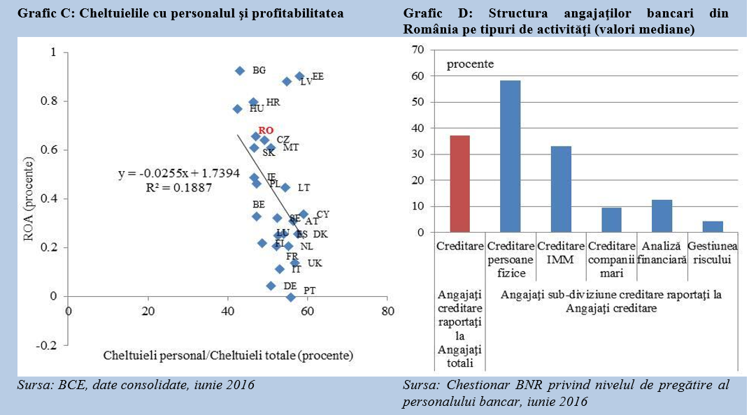 In sectorul bancar din Romania, raportul dintre cheltuielile cu personalul si cheltuielile totale s-a mentinut inferior medianei la nivel european pe parcursul ultimilor 3 ani (47%, fata de 52% in UE, iunie 2016), factor favorizant pentru profitabilitatea sectorului local (Grafic C, mai jos)