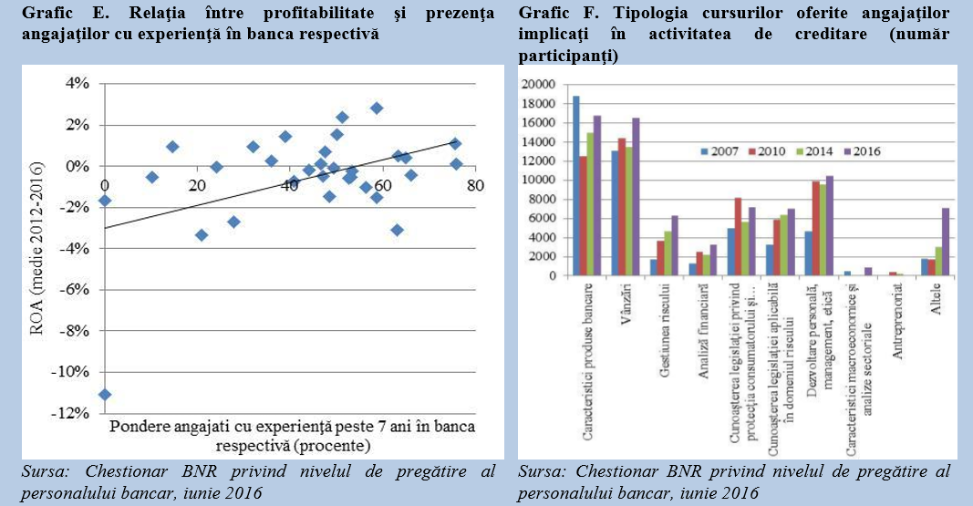 BNR a transmis bancilor un chestionar prin care a solicitat date privind nivelul de pregatire a personalului. Chestionarul a fost completat de 32 de banci (98,6% din activele bancare), avand ca data de referinta iunie 2016. Aspectele calitative urmarite au fost: (i) structura angajatilor pe tipuri de activitati bancare, (ii) existenta studiilor economice sau a certificarilor internationale la nivelul angajatilor bancari, (iii) experienta angajatilor, (iii) politica de salarizare si de pregatire profesionala. Analiza acestor caracteristici contribuie la evaluarea modului in care politica de pregatire a personalului bancar a contribuit sau nu la calitatea procesului de intermediere bancara. In plus, BNR analizeaza nivelul de pregatire profesionala a personalului bancar, din perspectiva asigurarii indeplinirii obiectivului intermediar al politicii macroprudentiale de crestere sustenabila a intermedierii financiare