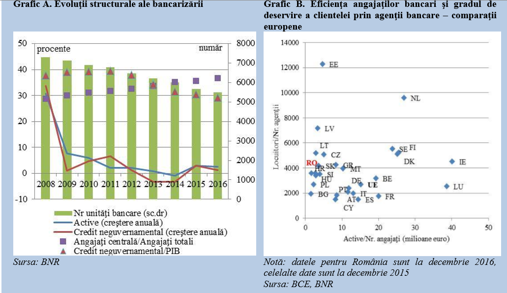 „Eficienta personalului bancar romanesc este inca redusa, in contextul unui grad de intermediere financiara scazut: un angajat bancar gestioneaza in medie 1,7 milioane euro (decembrie 2016), fata de 15,1 milioane euro la nivelul UE. Activele raportate la angajat au crescut treptat in ultimii noua ani (de la 1,2 milioane euro/angajat, decembrie 2008), atat pe fondul cresterii activelor, cat si al reducerii numarului de angajati, imbunatatind eficienta”, arata Raportul BNR. In contextul dezintermedierii manifestate ulterior crizei, numarul de agentii s-a redus, diminuarea personalului fiind mai putin pregnanta la nivelul sediilor centrale (Grafic A, imediat mai jos).