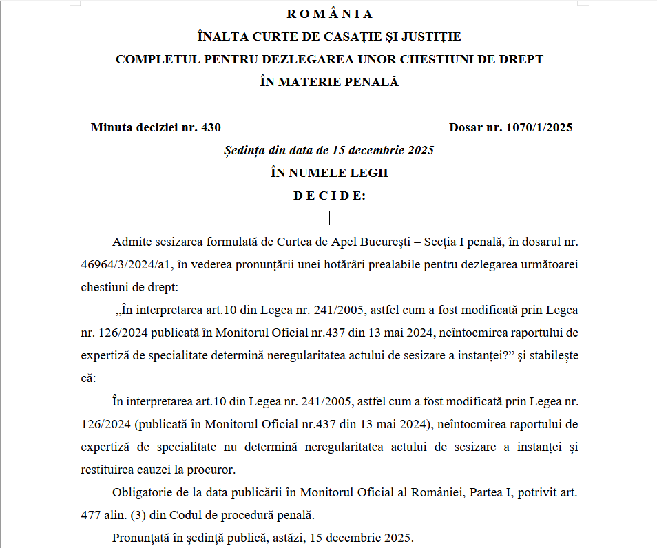 Este vorba despre o decizie a completului pentru dezlegarea unor chestiuni în drept al Înaltei Curți de Casație și Justiție, care în luna mai a fost solicitat de Curtea de Apel București să clarifice dacă expertizele de specialitate sunt obligatorii în faza de urmărire penală.