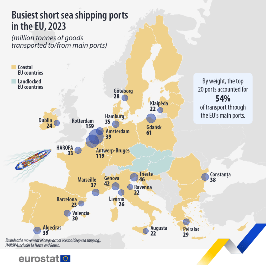 În 2023, greutatea totală a mărfurilor transportate către/dinspre principalele porturi din UE prin transport maritim pe distanțe scurte a fost de 1,6 miliarde de tone; aceasta a reprezentat o scădere de 5,4% față de 2022.