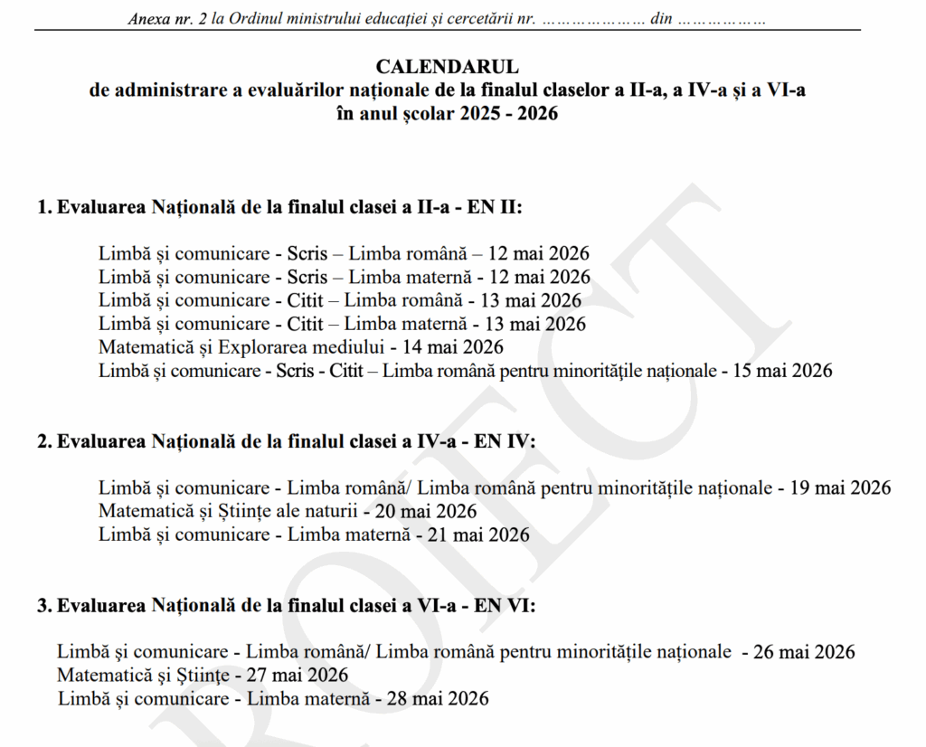 Potrivit proiectului de calendar pentru Evaluarea Națională 2026, publicat la începutul lunii septembrie de Ministerul Educației și aflat în consultare publică, evaluarea națională la clasa a II-a este programată între 12 și 15 mai, la clasa a IV-a între 19 și 21 mai, iar la clasa a VI-a între 26 și 28 mai.