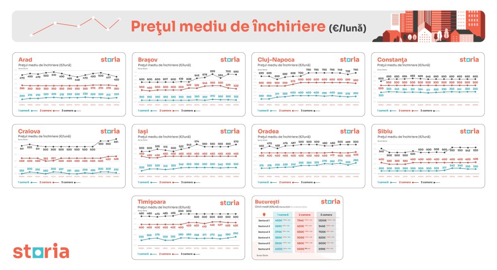 Prețurile solicitate pentru chiriile din cele 10 orașe cu cele mai multe anunțuri pe Storia au crescut cu 7% în luna martie 2025 vs. martie 2024. În raport cu luna anterioară (februarie 2025), prețurile din luna martie au scăzut cu 1%.