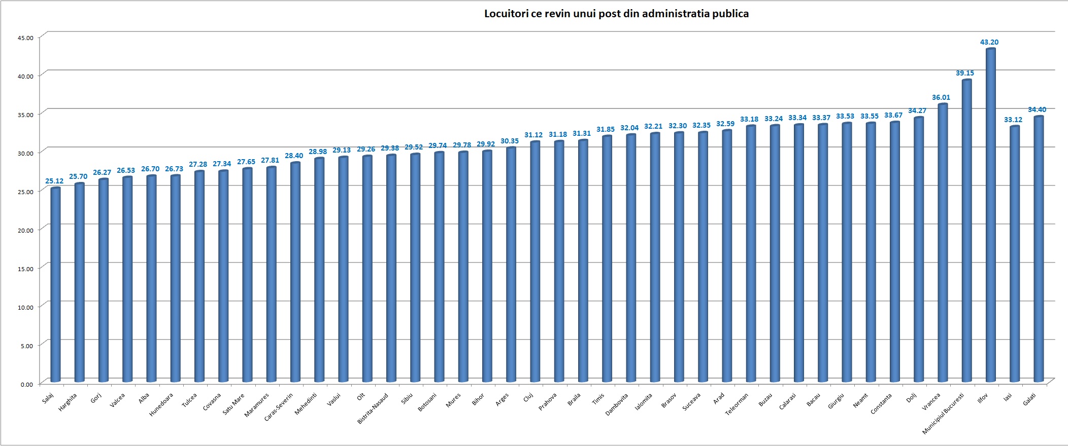 Imbunatatirea conditiilor salariale in sectorul public a dus, asa cum era de banuit, la o crestere a numarului de angajati in administratia publica locala cu peste 10% fata de finalul anului 2014), potrivit datelor transmise pentru HotNews.ro de catre Minsiterul Finantelor Publice. Din cele 1,2 milioane de posturi ocupate in administratia publica, circa 500.000 sunt in adminsitratia publica centrala, iar peste 700.000 sunt posturi ocupate in administratia locala. In judetul Salaj, avem circa 25 de locuitori „arondati” unui angajat in sectorul public, cei mai multi fiind in Ilfov si Bucuresti, cu cate 40 de locuitor/salariat public.