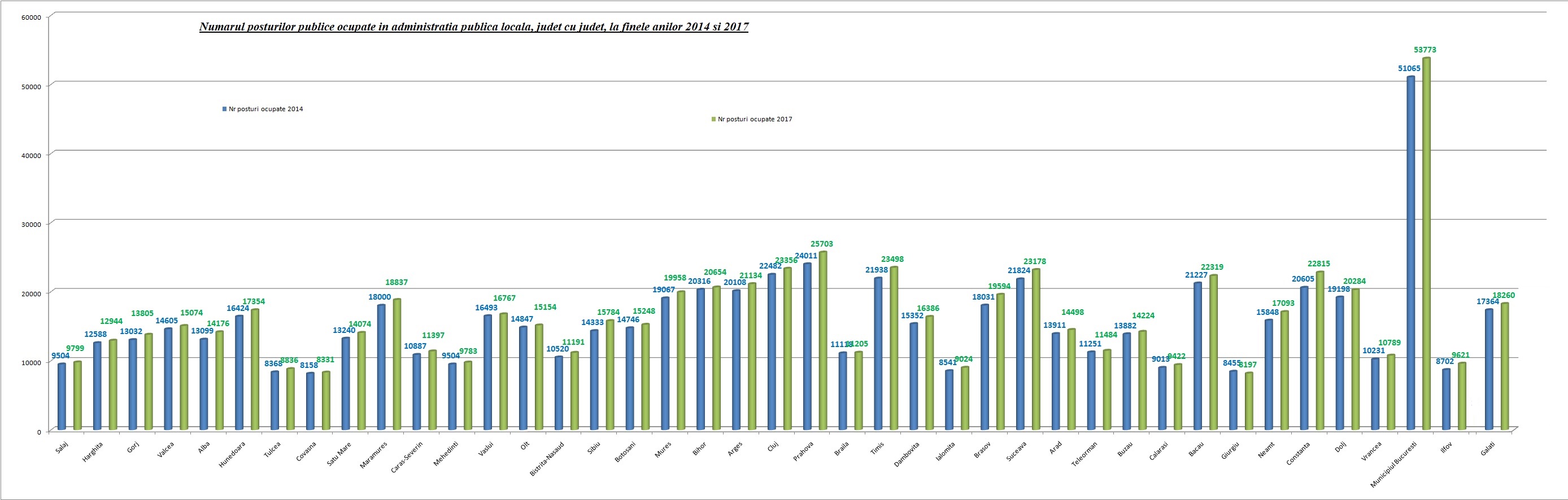 Mai jos, aveti in valori absolute numarul de posturi ocupate in administratia publica locala, la finele lui 2014 (cu albastru) si respectiv 2017 (cu verde). Click pe imagine pentru a o mari.