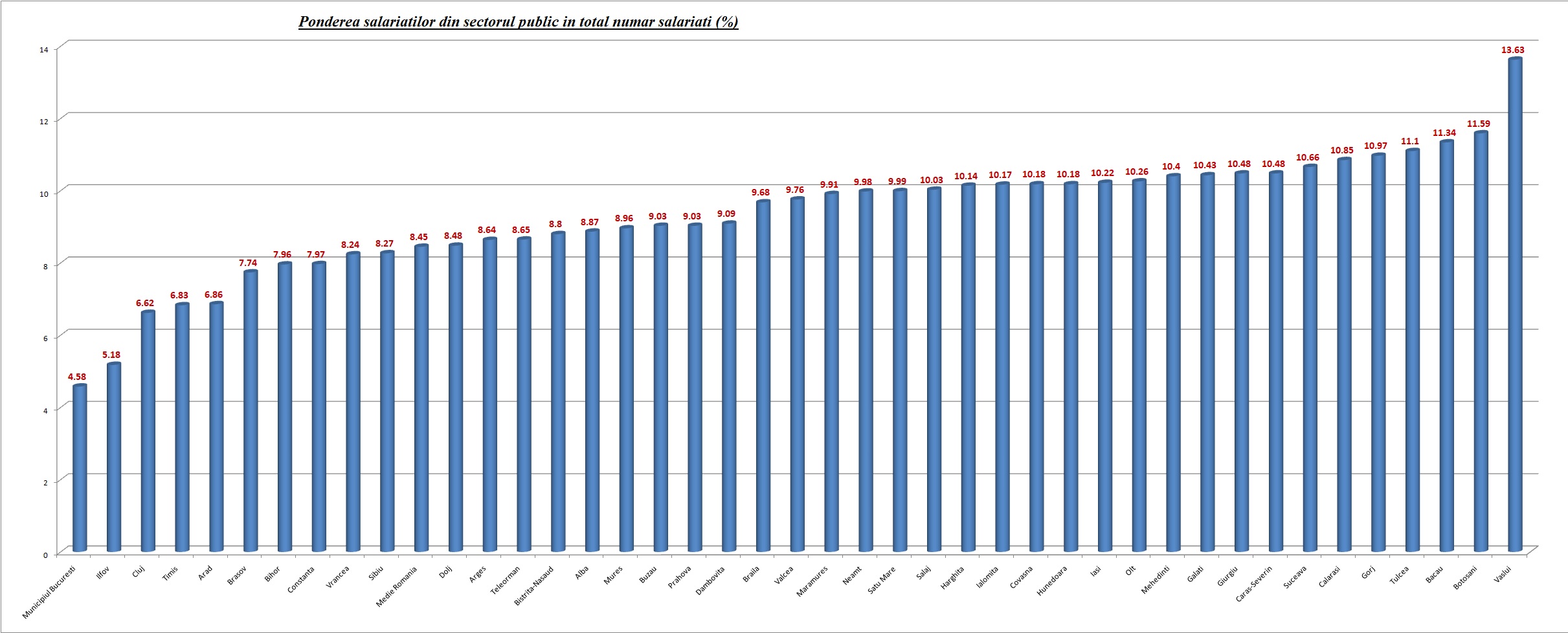 Interesant mi se pare graficul de mai jos, care ne arata ponderea salariatilor din administratia publica in numarul total de salariati, judet cu judet. In Vaslui, unul din 8 salariati lucreaza in sectorul public. In Botosani, Bacau, Tulcea, Gorj, Calarasi, Suceava si alte 11 judete, cel putin un salariat din 10 e angajat la Stat. Click pe imagine pentru a o mari.